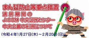 2022年1月27日 / 最終更新日時 : 2024年4月15日 chuo まん延防止等重点措置適用期間(令和4年1月27日(木)~3月6日(日))の J:COM 中央区民センター・中央会館の利用について コメントを残す コメントをキャンセルメールアドレスが公開されることはありません。 * が付いている欄は必須項目ですコメント * 名前 * メール * サイト