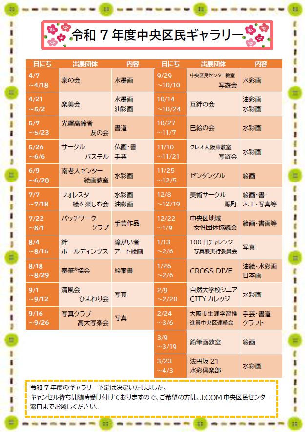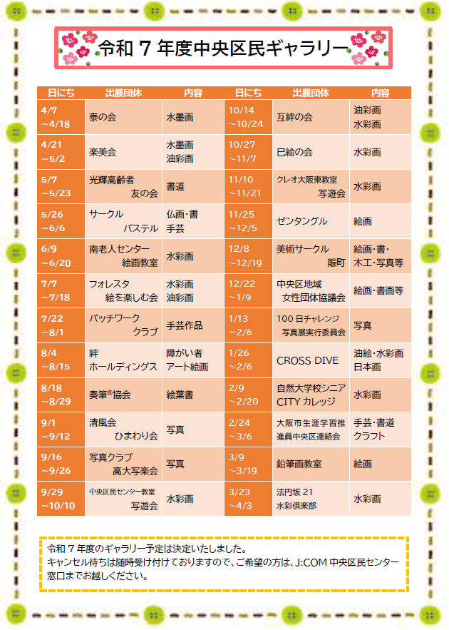 2025年10月11日 / 最終更新日時 : 2026年1月22日 chuo 令和7年度ギャラリー展示 場所 中央区役所1階ロビー 見学時間 中央区役所開庁時間内 ※平日・第4日曜 午前9時~午後5時30分 金曜日 午前9時~午後7時 コメントを残す コメントをキャンセルメールアドレスが公開されることはありません。 * が付いている欄は必須項目ですコメント * 名前 * メール * サイト