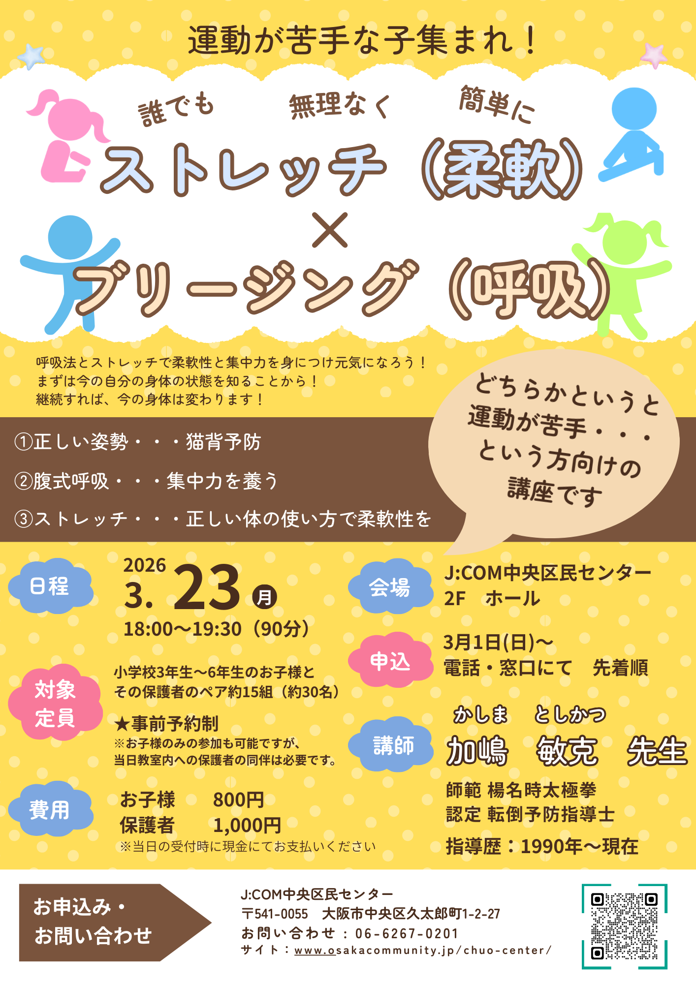 2026年2月24日 NEW! / 最終更新日時 : 2026年2月24日 chuo 【3/1~受付開始】3/23(月)「ストレッチ(柔軟)&ブリージング(呼吸)親子講座」募集のお知らせ 2026年3月23日(月)に、以下の講座を開講いたします。 運動が苦手な子に是非受講してほしい講座です。 3月1日~募集開始します! コメントを残す コメントをキャンセルメールアドレスが公開されることはありません。 * が付いている欄は必須項目ですコメント * 名前 * メール * サイト