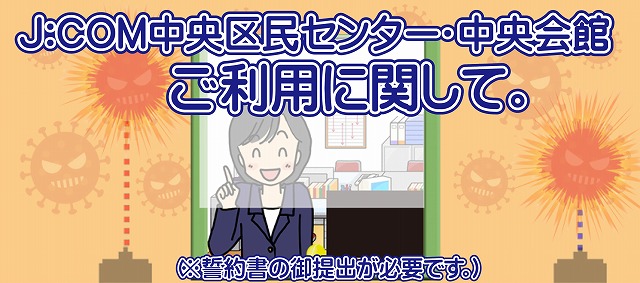 J:COM中央区民センター・中央会館の利用にあたりまして、新型コロナウイルス感染症の拡大防止対策にご協力をいただき、誠にありがとうございます。