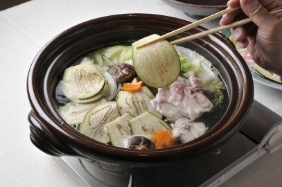 日本料理 湯木 店主 湯木 尚二 氏 考案【水茄子と黒豚のしゃぶしゃぶ】