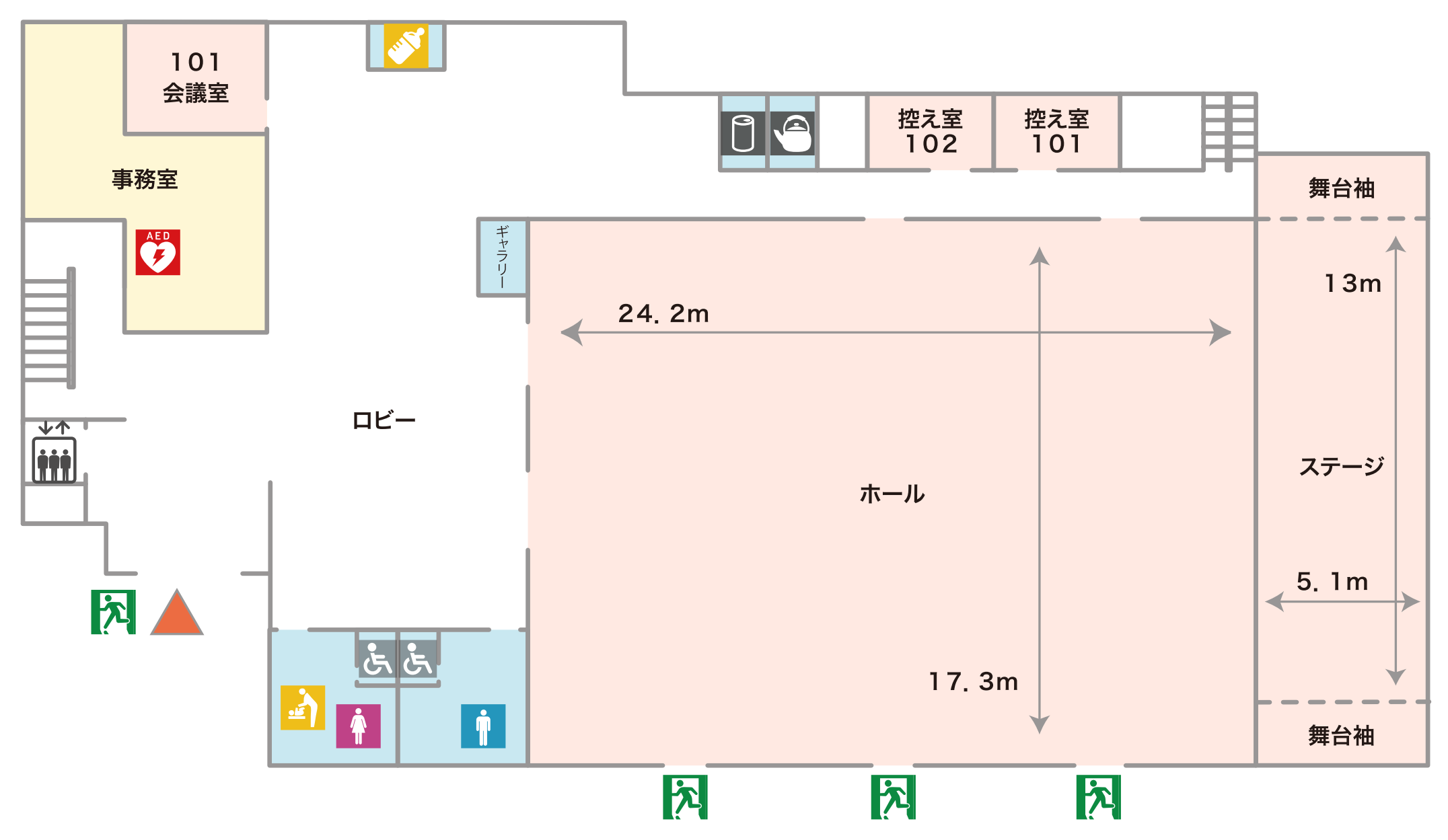 | 使用例 | 演奏会、コンテスト、講演会、会議、ダンス等、大規模な会議から簡単なスポーツを楽しむこともできます。 ホール専用の控室として控室101・102も無料でお使いいただけます(どちらの部屋にも姿見・洗面台・ハンガーラックあり)。 ▼図面ダウンロードはこちら |