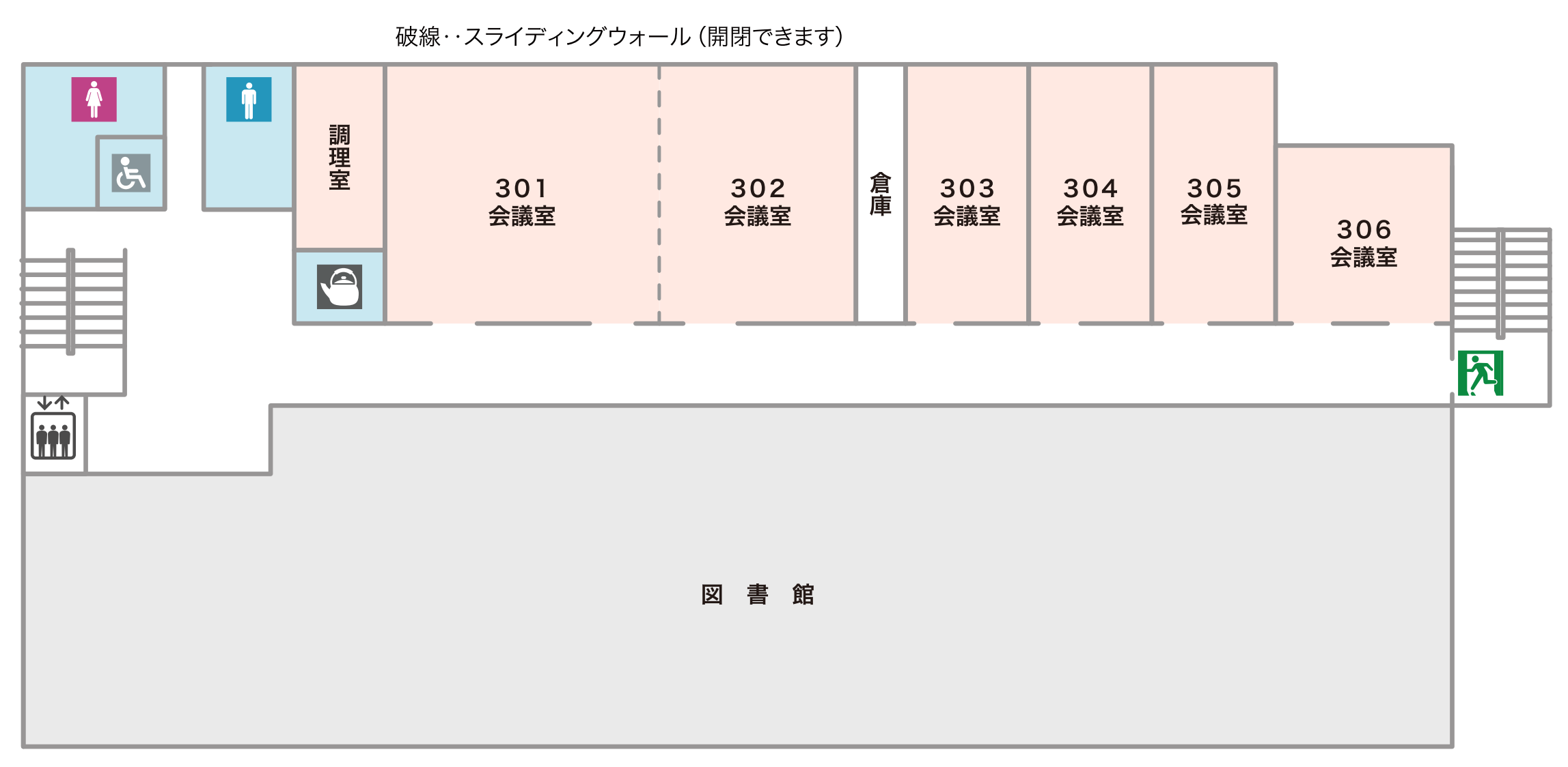 | 備考 | 301会議室、302会議室と通しでもお使いいただけます。(マイク利用可) ▼図面ダウンロードはこちら |