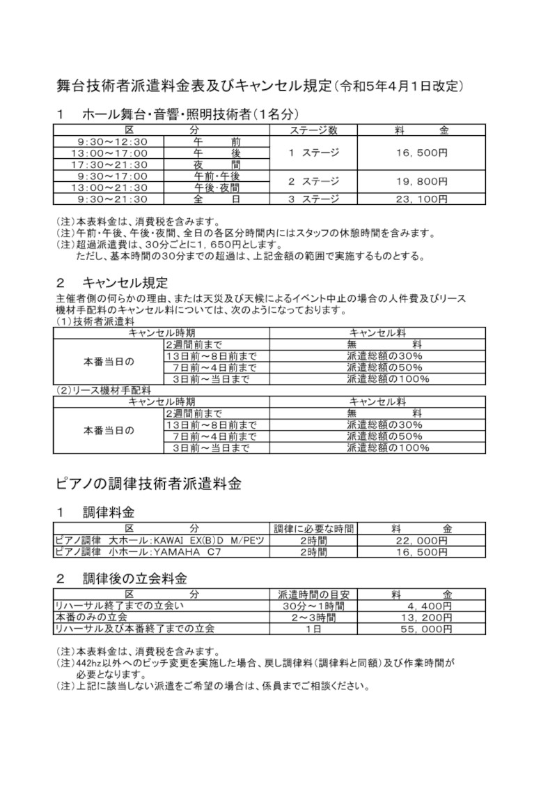 令和5年4月1日より大ホール/小ホール舞台技術者派遣料の改定について