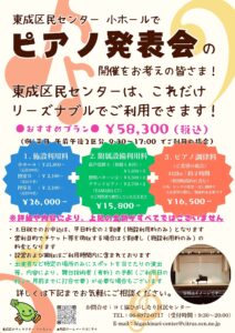 コミ協ひがしなり区民センターの小ホール(定員209名)でピアノ発表会でのご利用はいかがでしょうか?