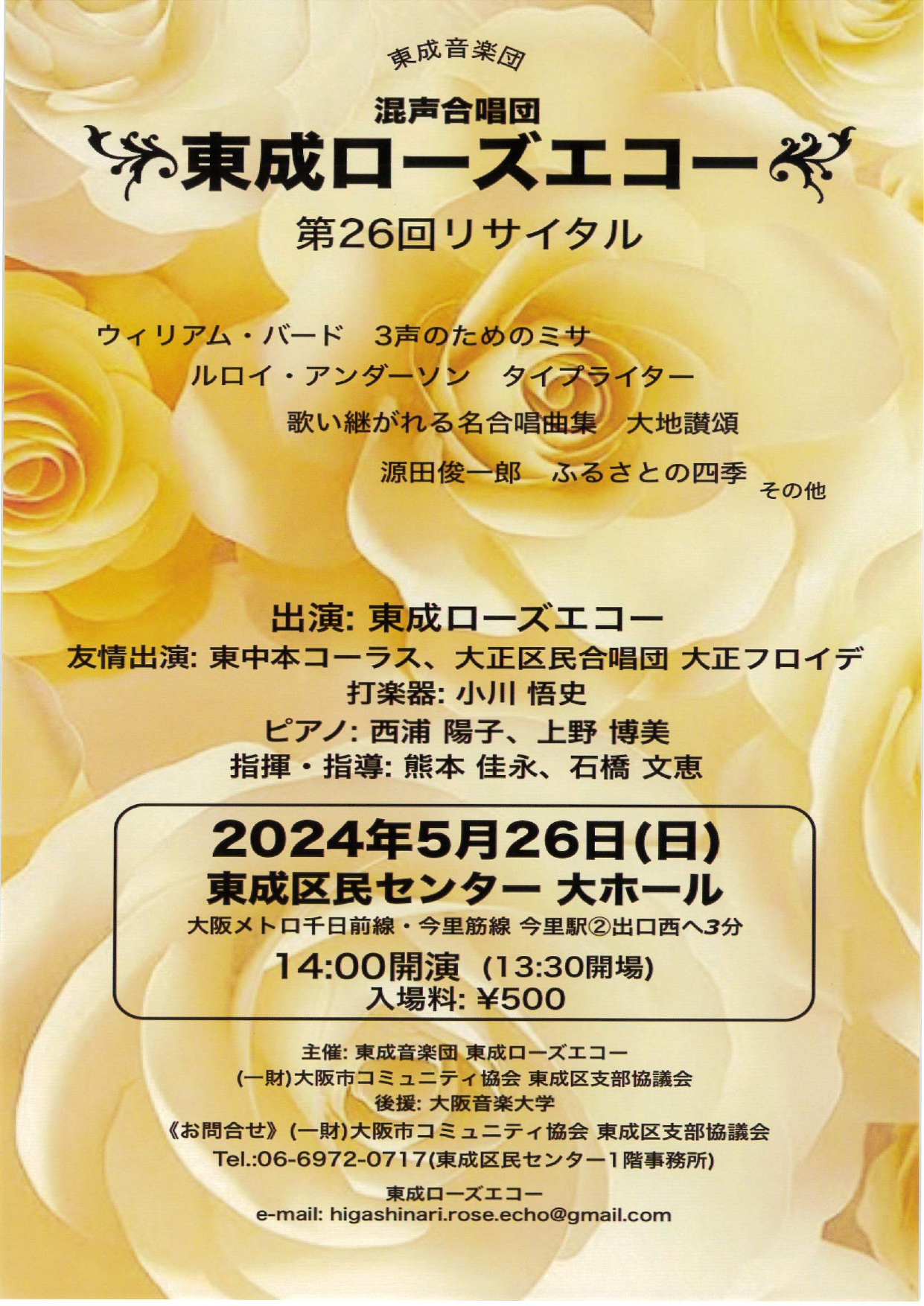 【終了いたしました】混声合唱団 東成ローズエコー第26回リサイタル