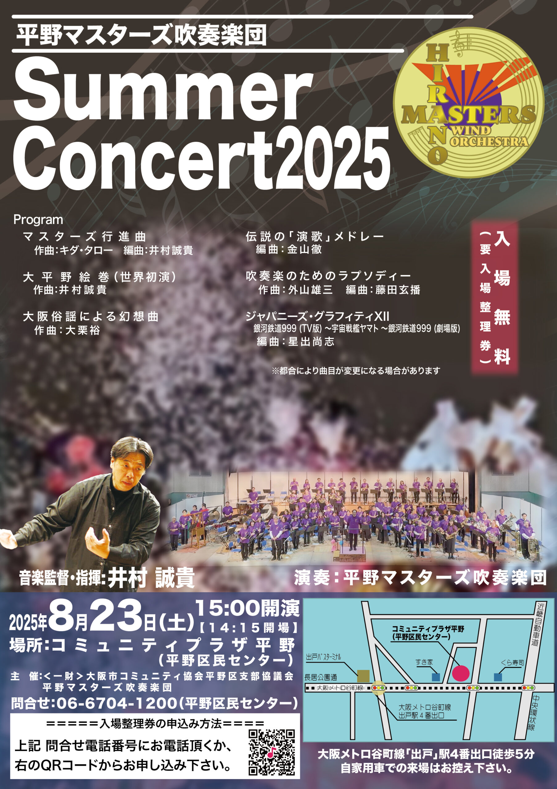 平野マスターズ吹奏楽団Summer Concert 2025が8月23日(土)に平野区民センターにて開催されます。