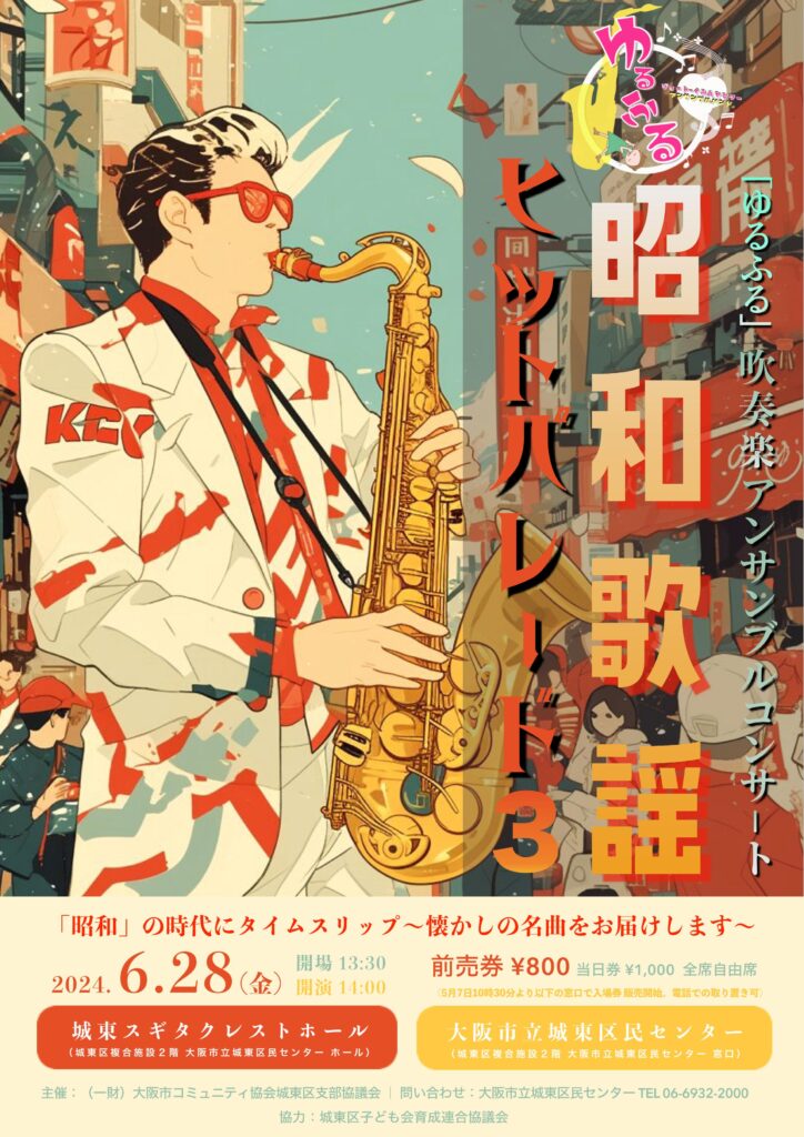 城東区民センター吹奏楽アンサンブルバンド「ゆるふる」による昭和歌謡をテーマにしたコンサートです。