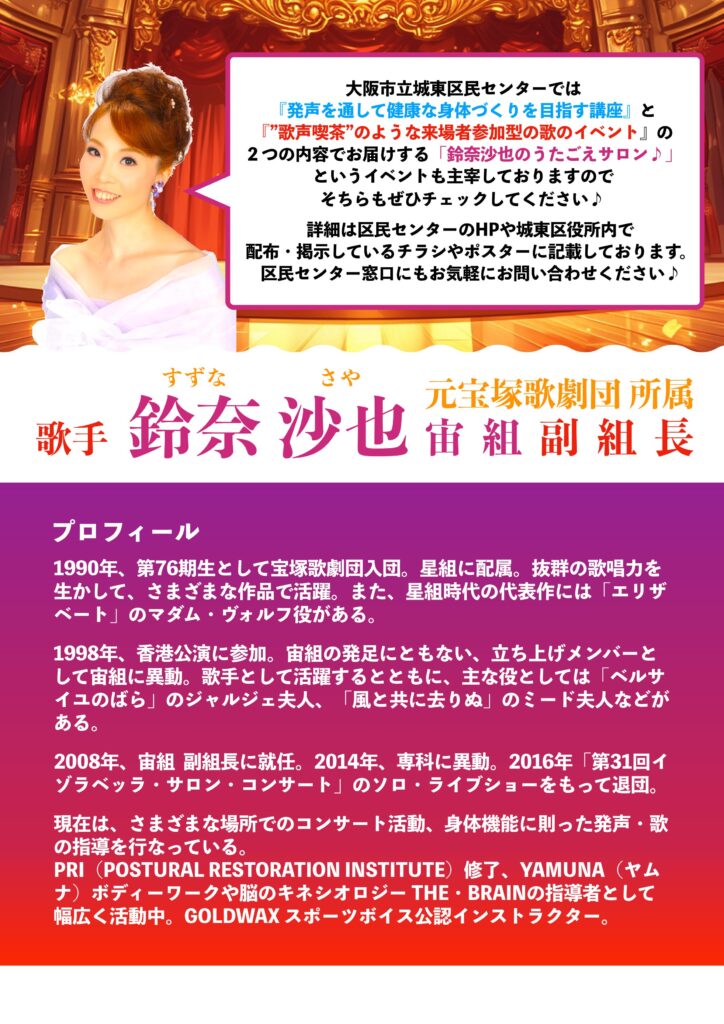 今回は元宝塚歌劇団 宙組副組長の鈴奈沙也さんをゲストに招きミニ歌謡ショーも開催します。