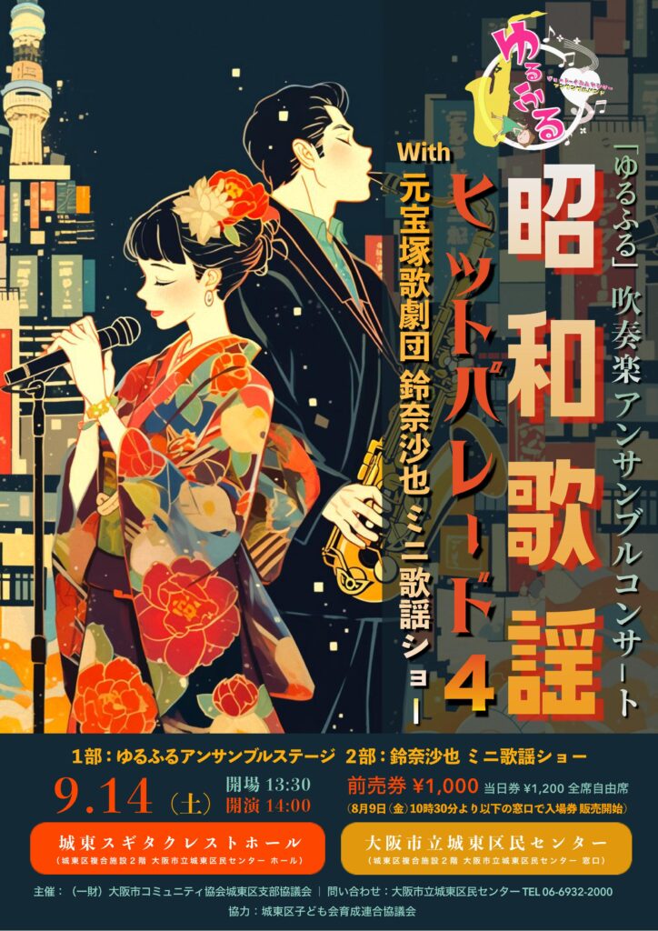 城東区民センター吹奏楽アンサンブルバンド「ゆるふる」による昭和歌謡をテーマにしたコンサートです。