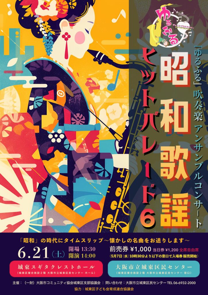 城東区民センター吹奏楽アンサンブルバンド「ゆるふる」による昭和歌謡をテーマにしたコンサートです。