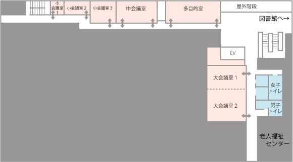 | 備考 | 設備:机6、イス18 飲食、喫煙、マイク、スピーカー等音の出る機器の使用、楽器練習、大きな声を出すこと、墨、絵の具の使用、すべて禁止。 |