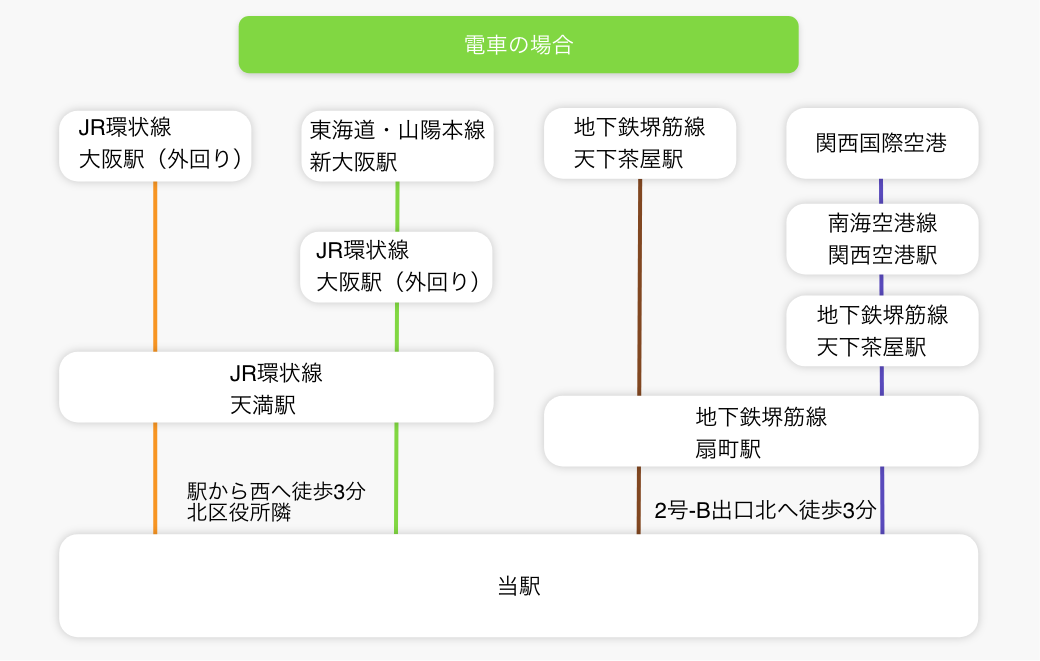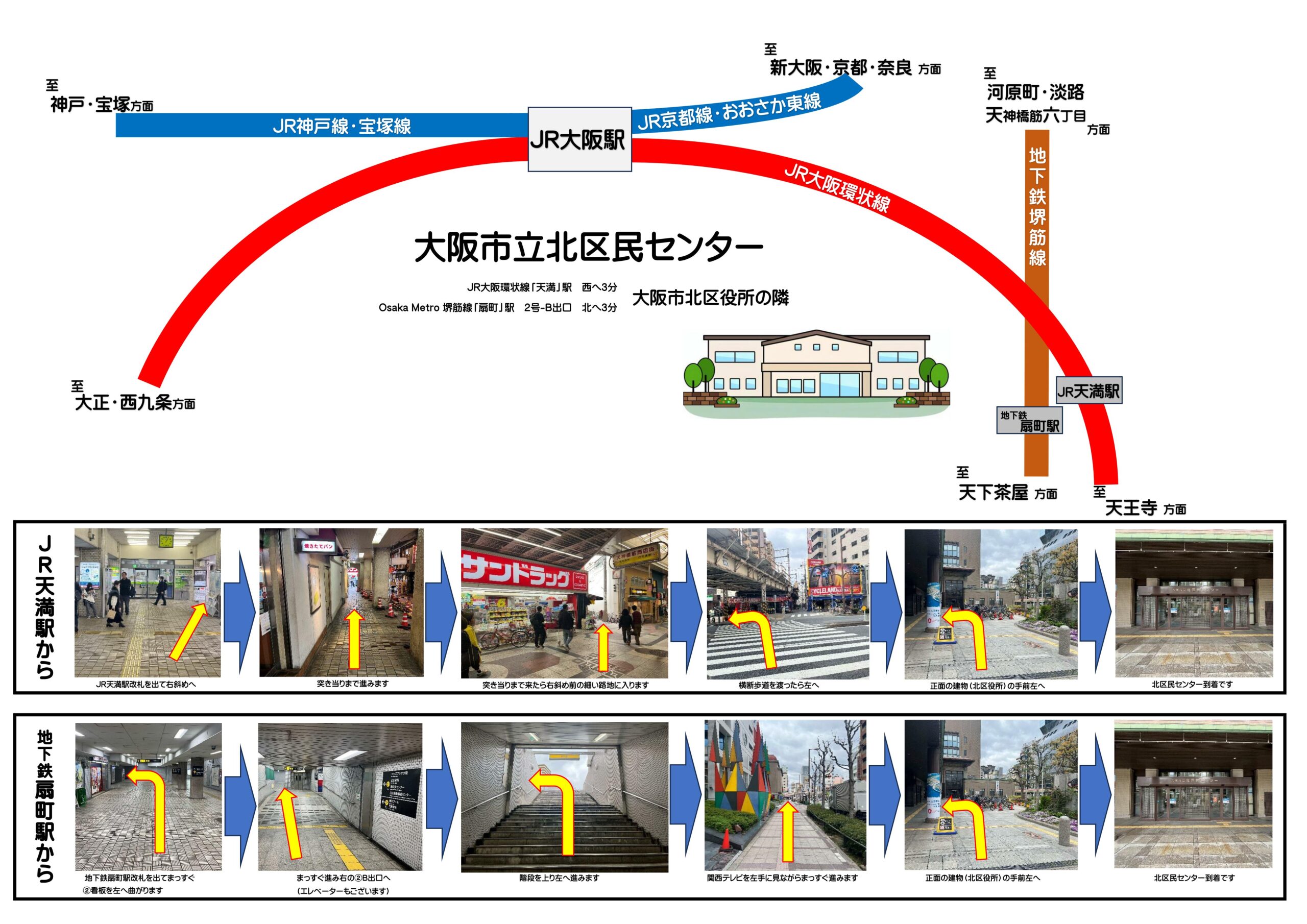 Osaka Metro 堺筋線「扇町」駅 2号-B出口北へ3分、JR大阪環状線「天満」駅 西へ3分 大阪市北区役所の隣
