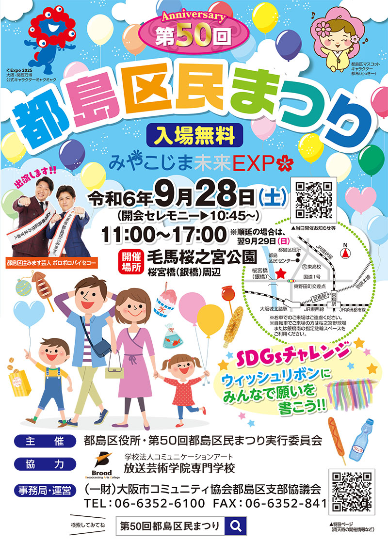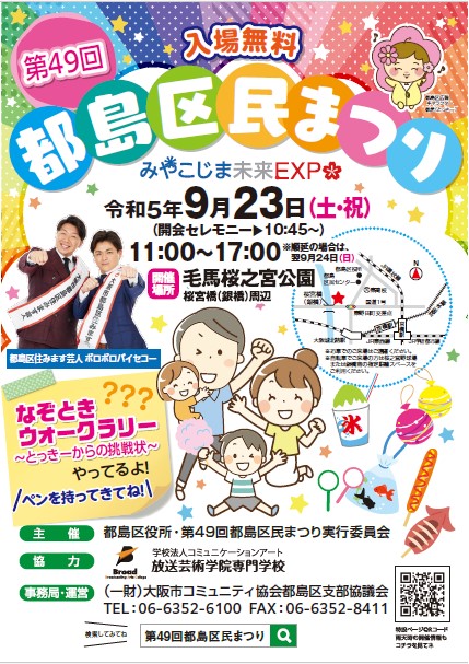 第51回 都島区民まつり \6月1日より各種募集開始!/ ▶第51回都島区民まつり 特設サイトはコチラ ▶過去の第50回都島区民まつりHPはコチラ 日時 9月27日(土) 11:00~17:00 会場 毛馬桜之宮公園(大阪市都島区) 関連リンク 第51回都島区民まつりXInstagramfacebook