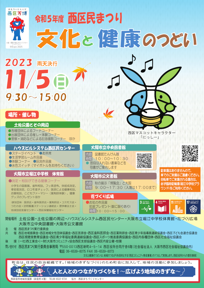 - ハウスビルシステム西区民センター、中央図書館、公文書館、堀江中学校体育館、土佐公園と周辺地域