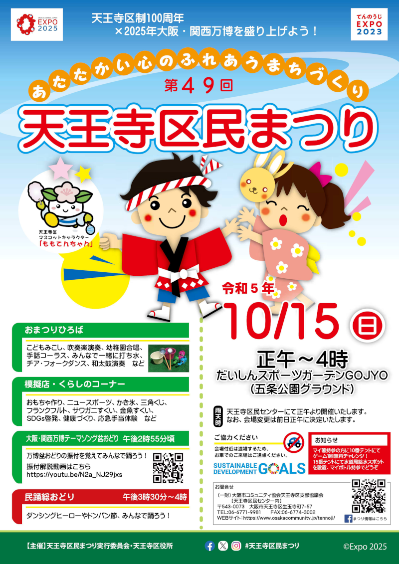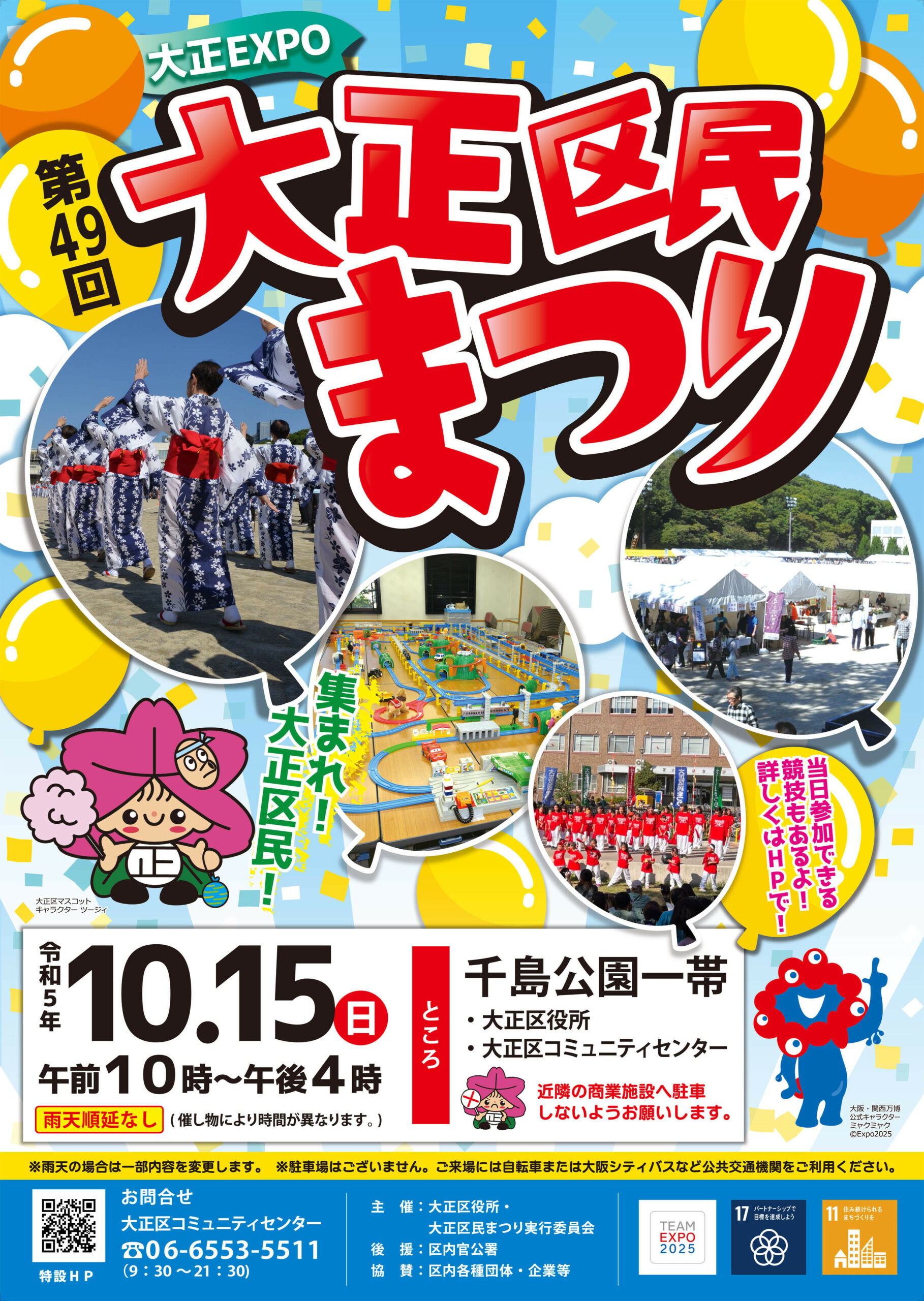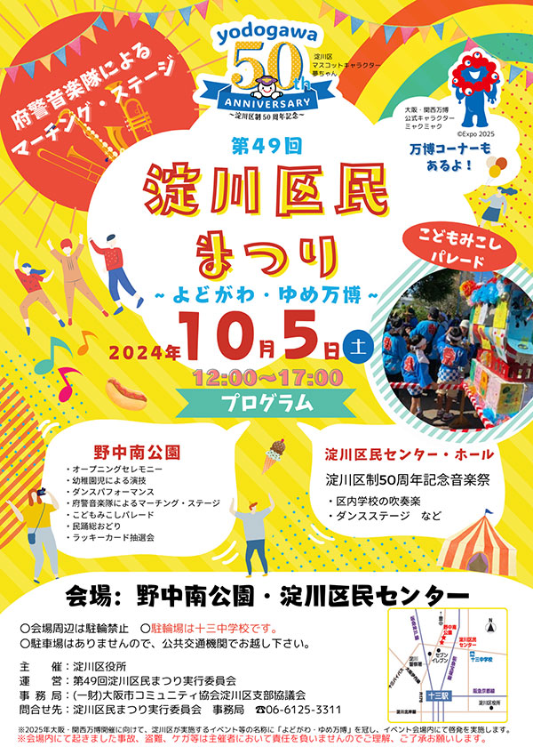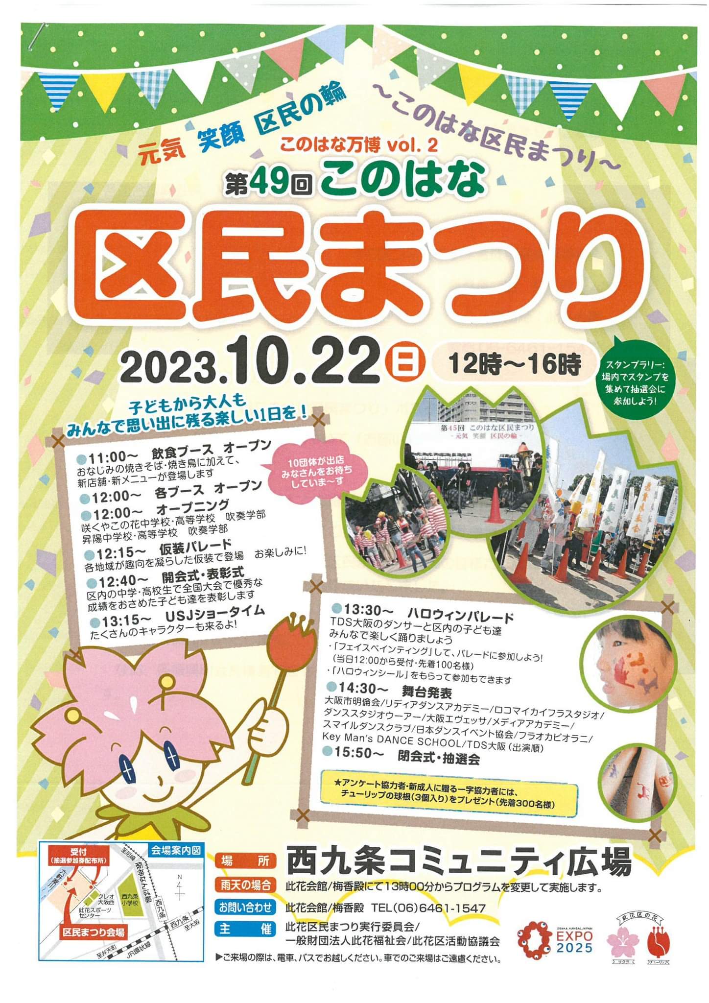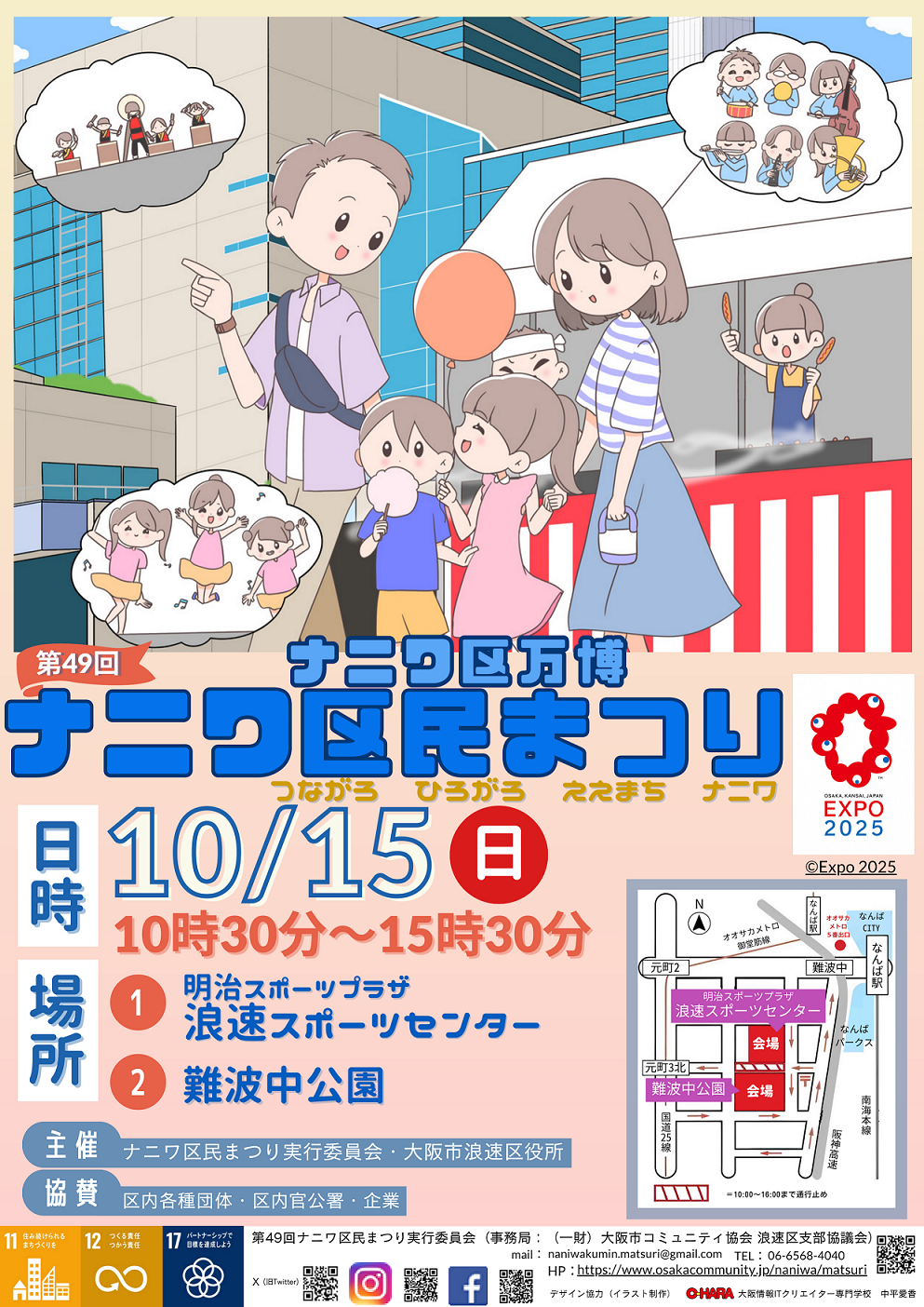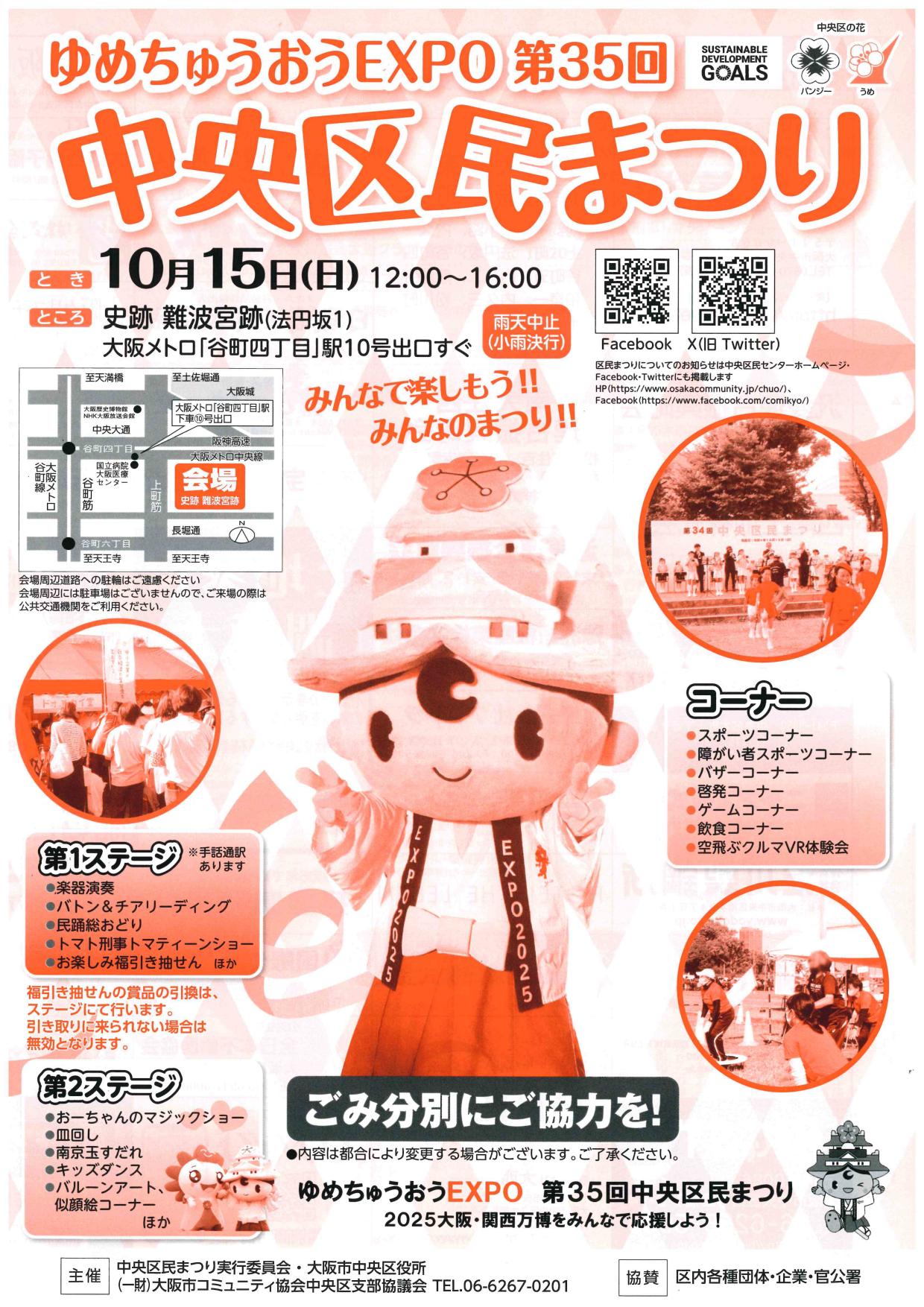 ゆめちゅうおうEXPO 第36回中央区民まつり 日時 10月20日(日) 11:00~15:00 (10:30プレオープン) 会場 史跡 難波の宮跡 (大阪市法円坂1) 関連リンク ゆめちゅうおうEXPO 第36回中央区民まつり 専用ホームページ史跡 難波の宮跡 地図