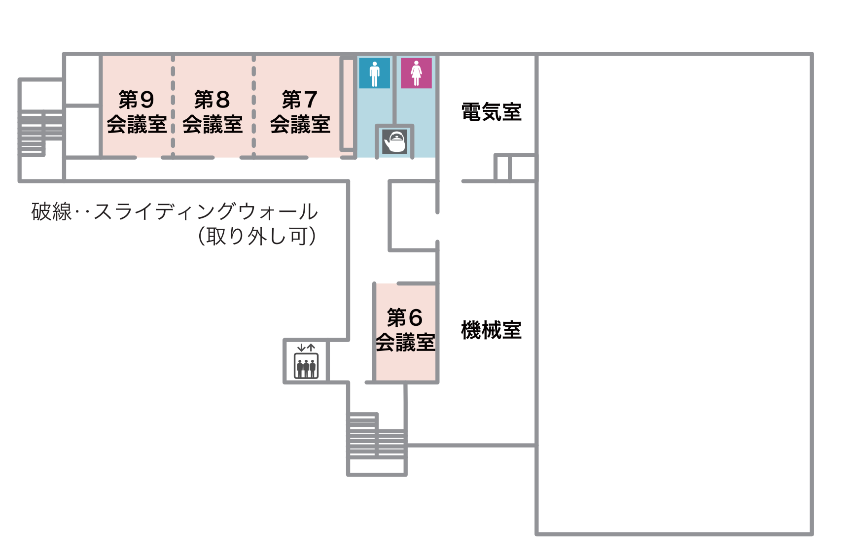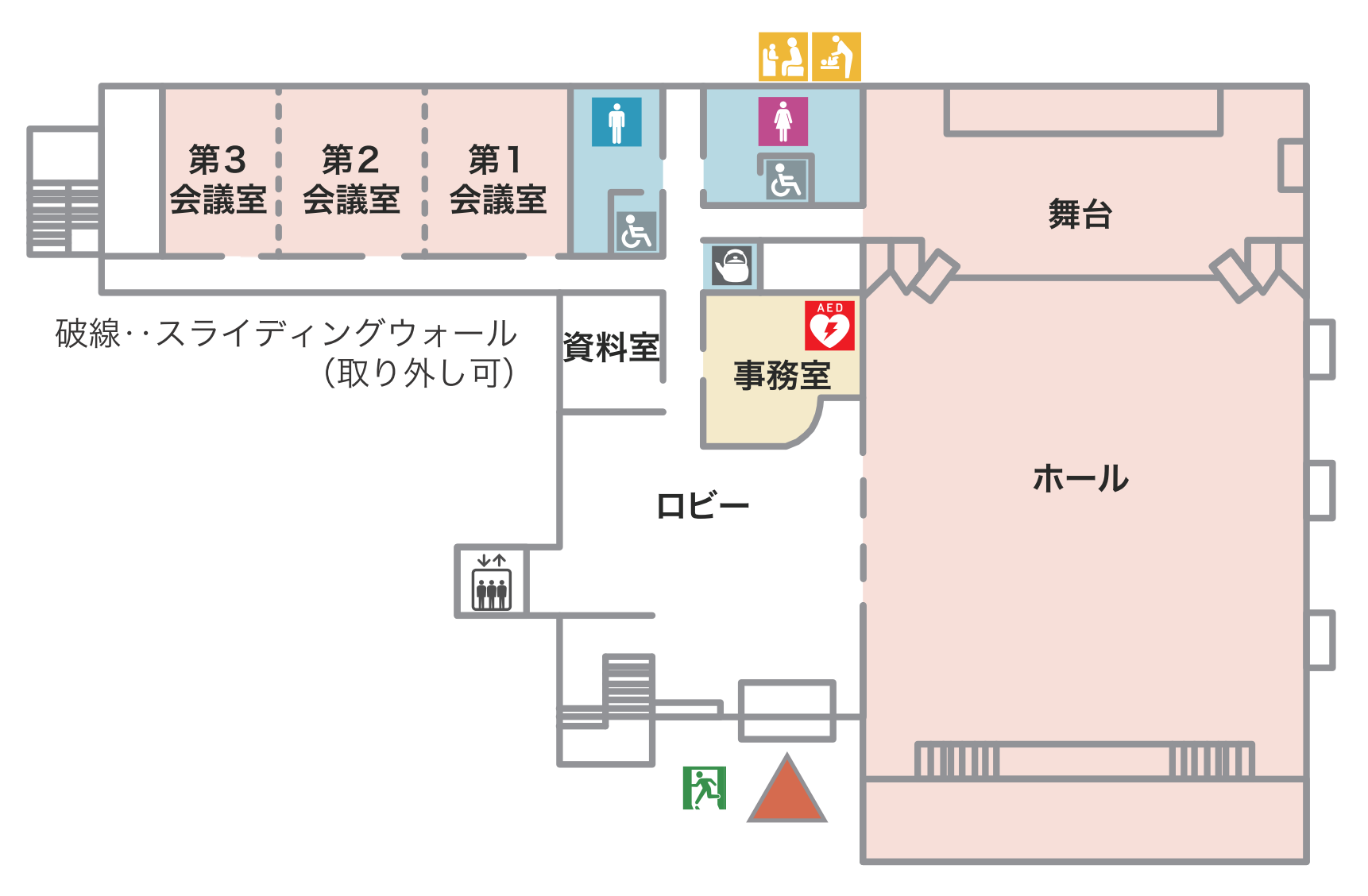 | 備考 | 机8台(サイズW180×D60×H70)椅子24台 演劇など大声を出す場合や楽器演奏、コーラス練習等は使用できません。 ※第1・2・3会議室はスライディングウォールを取り外して通しで利用できます。 |