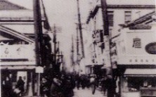 九条新道は明治三十年ごろに松島の地と源兵衛渡を一直線に結ぶ道路として新しく開設された。東端は尻無川に架かる花園橋であり、大阪市電の最初の起点となったところであったので急速に町がひらけ、そこにいろんな業種が商いを競う商店街が成立した。 最盛時の昭和初期には「西の心斎橋筋」と謳われるほど活気を呈した。道路幅員は六bしかないが、二七二店舗が両側にひしめいた。 |