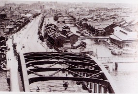 昭和橋は、その橋名からも分かるが西大阪における昭和初頭の都市計画事業の象徴として架橋されたものである。当時にいたるまで西区北部から木津川を越えて川口・本田地域に達する通路といえば本町通から木津川橋を渡る以外に方法がなかったので、現在の土佐堀通を御堂筋と同じように開いてその延長線上に橋を架けることが急務であった。それは大阪駅と大阪港を短時間で直結する輸送路を開設することでもあった。 橋の設計は、市の土木部職員によってなされ昭和四年に着工したが、当時では珍しく一部の土地収用が混乱したので一時工事を中止するというハプニングもあり、竣工は同七年五月になった。 木津川に斜めに架かっているのも一つの特徴だが、鉄材一三〇〇dを使用して周辺の軟弱地盤に対応させた「タイドアーチ」式橋梁は技術面で高い評価を受けた。それが現在では逆に周辺の地盤沈下による河水面の上昇が災いして満潮時の舟行を困難にしている。いみじくも工事報告は「設置ノ位置ハ木津川分流起点ニアリテ流勢ノ変化ヲ招来シ惹テ舟行ニ影響スルノ虞アリ」と見通している。 |