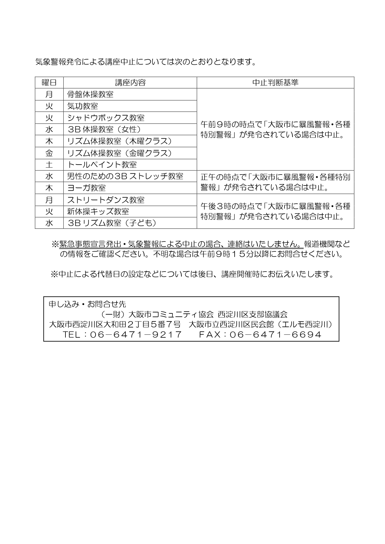 そのため、西淀川区民会館では下記のような内容で中止の判断をしております。