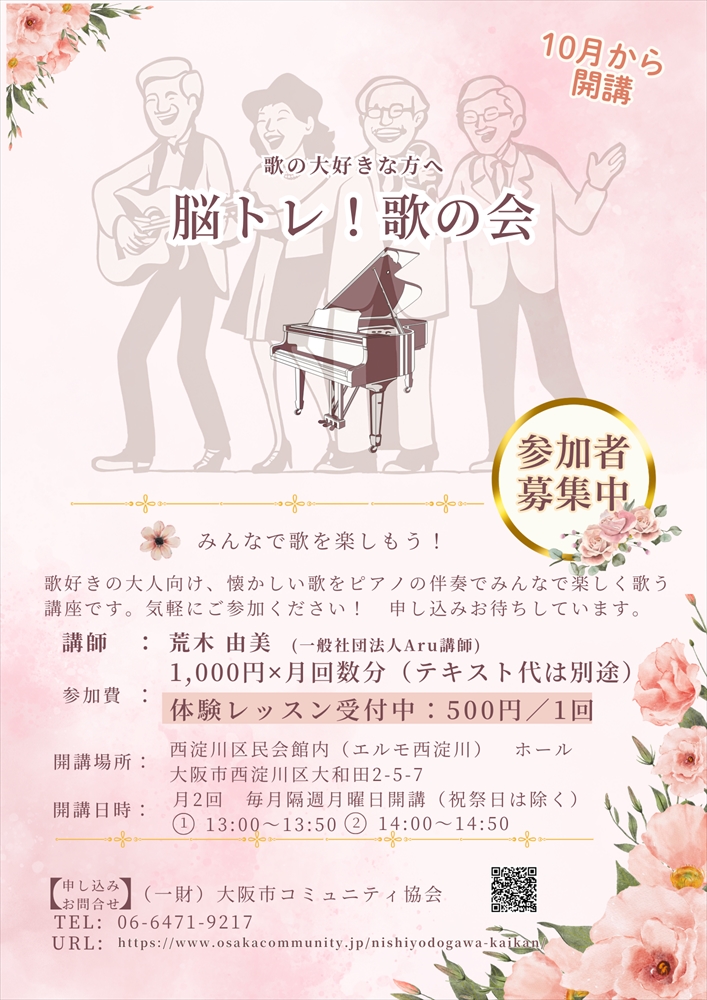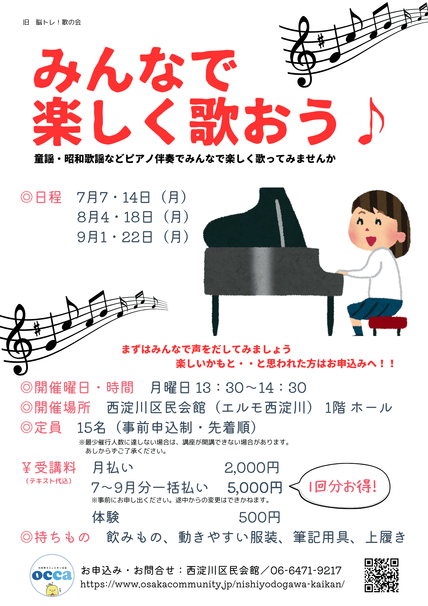 歌好きの大人向け、懐かしい歌をピアノを伴奏にみんなで楽しく歌う講座です。