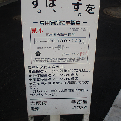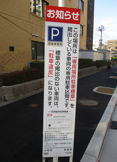 また、大正会館東側沿いに『専用場所駐車標章』を掲出している車両の専用駐車区間(4台分)がございます。標章の掲出の無い車両がこの場所に駐車すると「駐車違反」になります。