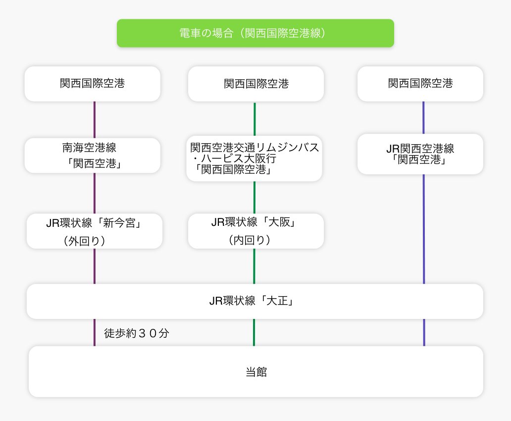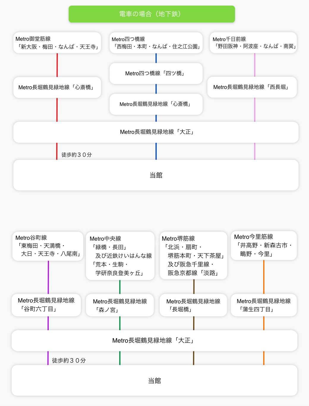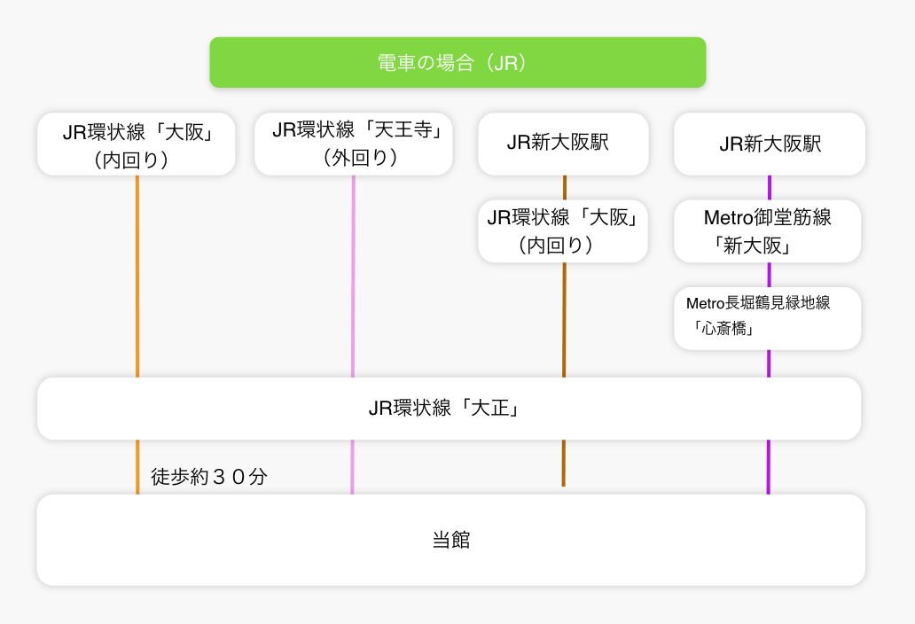 Osaka Metro長堀鶴見緑地線「大正駅」またはJR環状線「大正駅」から徒歩約30分