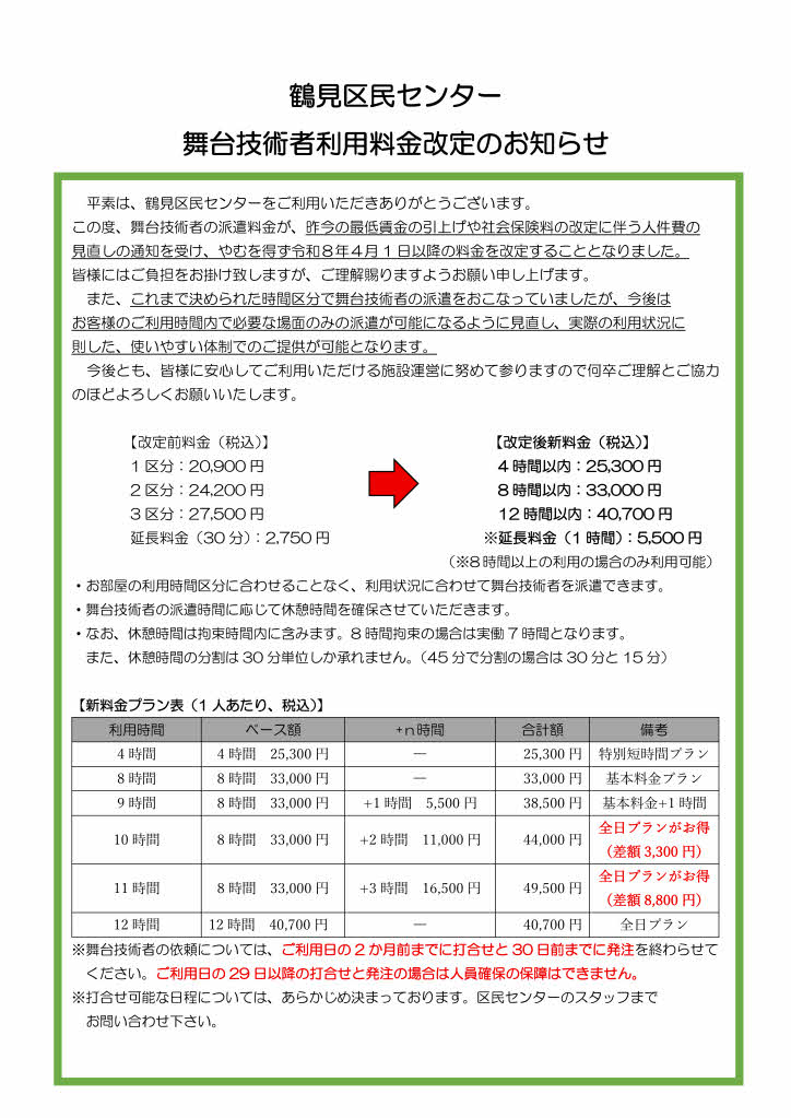 舞台技術者利用料金改定のお知らせ